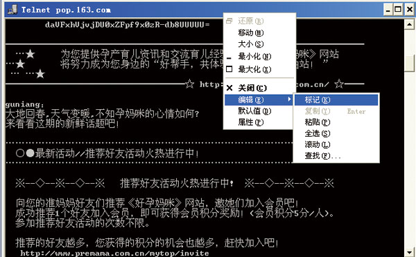 作为公司的电脑维修服务人员,经常要通过邮件解答客户的咨询。她一直使用网易邮箱,每次登录邮箱都必须等待加载网易页面。近来由于公司的网速比较慢,恰好又有一封重要客户的邮件需要处理,可登录邮箱时一直显示在加载广告页面,这下可把她急坏了。其实登录邮箱还可以借助Telnet命令行,这样不仅可以“不看广告”,而且速度很快。